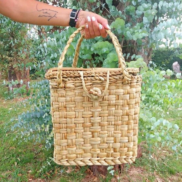 Canasta porta termo tejida en junco. Medidas 35 x 35 x 14 cm aprox.