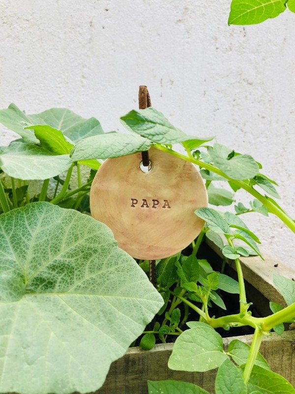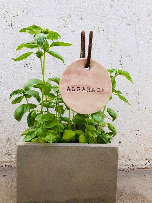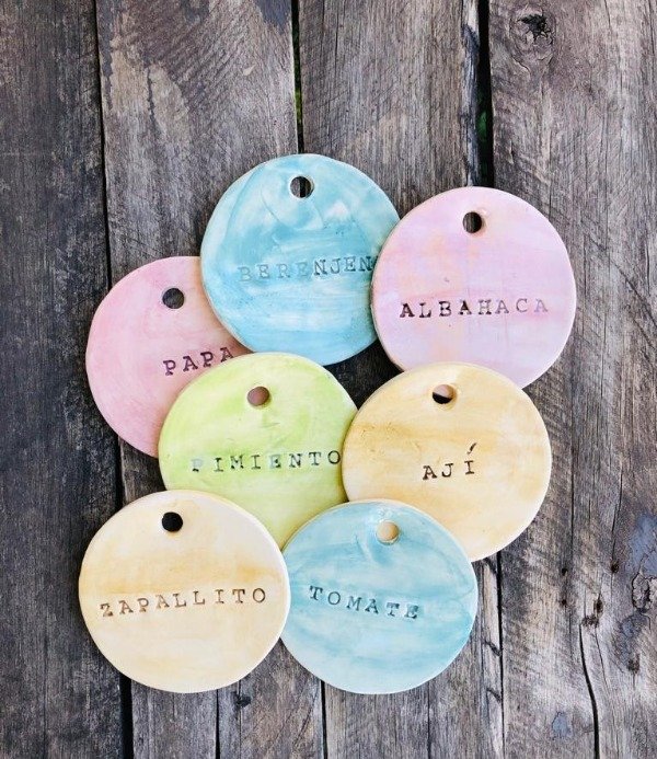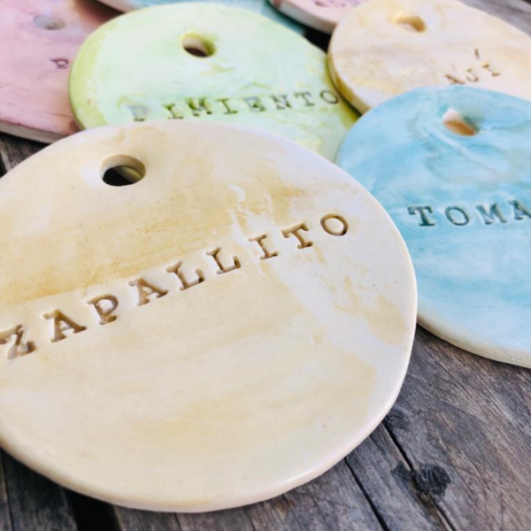 Indicador de huerta redondo realizado en cerámica esmaltada, con soporte de hierro